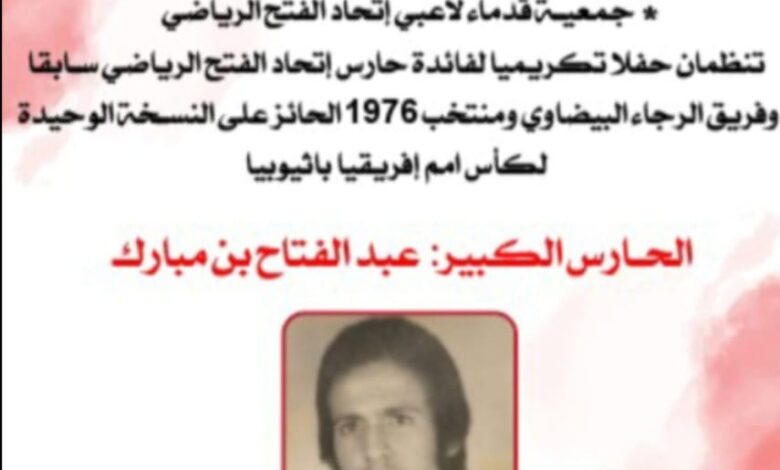 حين تلتقي الذاكرة الرياضية بروح الاعتراف ، يولد المعنى الحقيقي للوفاء . في هذا السياق ، بادرت جمعية مبادرة يعقوب المنصور ، بشراكة مع جمعية قدماء لاعبي الفتح الرباطي ، إلى تنظيم حفل تكريمي مميز على شرف الحارس الدولي السابق عبد الفتاح بن مبارك ، أحد رموز الكرة المغربية ، وأحد أبطال ملحمة كأس افريقيا للأمم سنة 1976 .