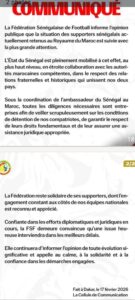 تُعلم الاتحادية السنغالية لكرة القدم الرأي العام أن وضعية المشجعين السنغاليين المحتجزين حاليًا بالمملكة المغربية تحظى بمتابعة دقيقة وبأقصى درجات الاهتمام.